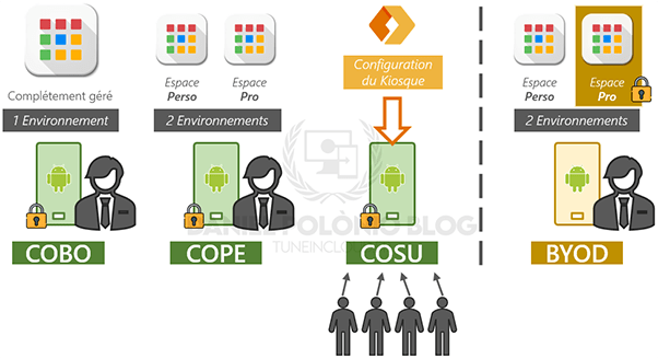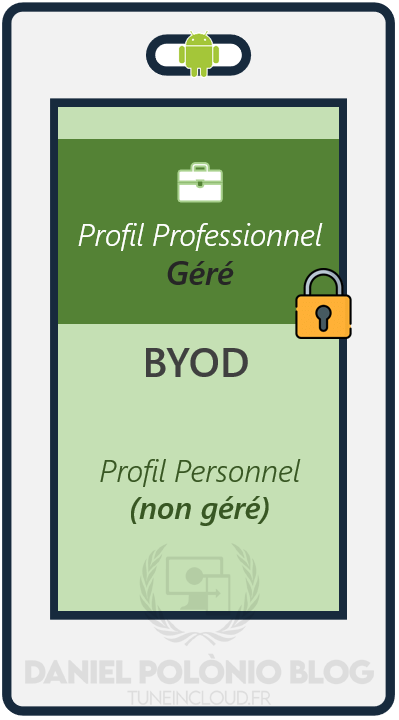 L’expérience utilisateur BYOD est fortement similaire au mode COPE. Dans le mode COPE, il s’agit d’un appareil d’entreprise sur lequel l’entreprise à laisser la possibilité à l’utilisateur d’avoir son espace personnel. Dans le mode BYOD, c’est un appareil personnel sur lequel l’utilisateur a autorisé son entreprise à y gérer une partie professionnelle.