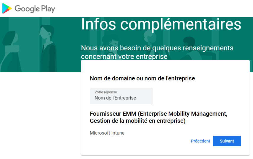 Une page Google Play s’ouvre alors, demandant le nom de l’entreprise et la validation pour définir Microsoft Intune comme fournisseur EMM (Gestion de la mobilité d’entreprise)