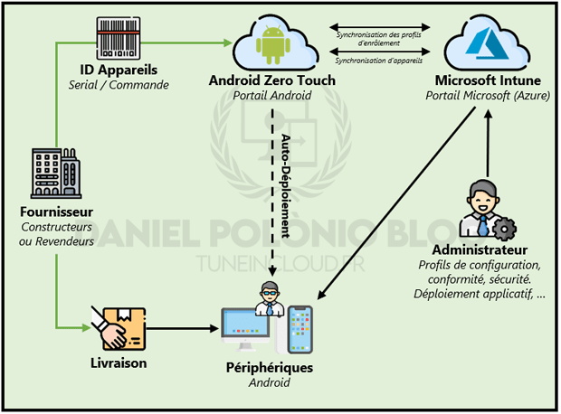 Microsoft Intune et Android Zero Touch Enrollment proposent la possibilité de mettre en place un scénario d’inscription sans contact « en bloc » entièrement sur Intune. Il ne sera donc pas nécessaire de se connecter au portail ZTE pour associer les appareils à leur profil d’enrôlement Intune (comme présenté ci-dessus).