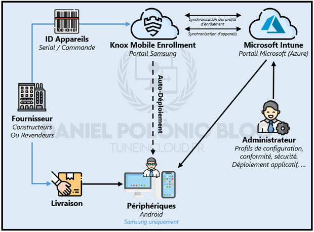 L’utilisation de Samsung Knox Mobile Enrollment (KME) permet de mettre en place un scénario d’enrôlement automatique au déballage de l’appareil. A l’instar de Autopilot pour les périphériques Windows, KME permet aux appareils Samsung (compatibles Knox) achetés par l’entreprise d’être pré affecté à un profil d’enrôlement Intune.