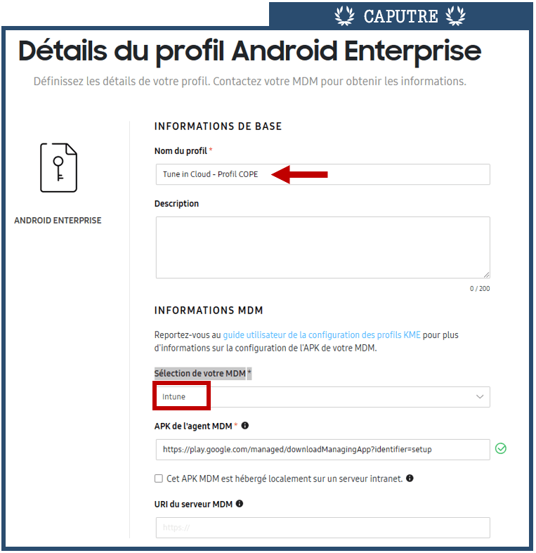 Sélectionner « Android Entreprise ». Dans la page suivante, indiquer le nom du profil KME souhaité et sélectionner « Intune » dans la liste déroulante « Sélection de votre MDM »