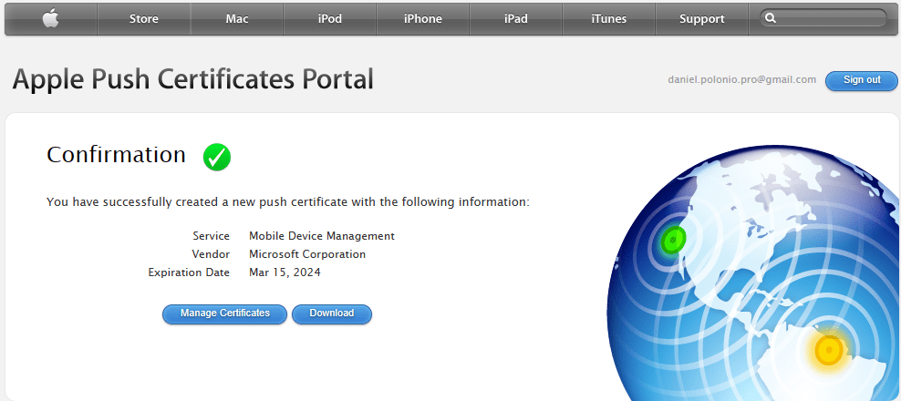 Le certificat Push MDM Apple a bien été créé, il est possible de le récupérer en cliquant sur le bouton « Download ». Le certificat sera en format PEM.
